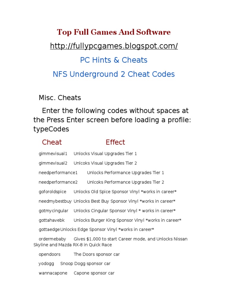 Cheatcodescom has all you need to win every game you play! need for speed underground cheat pc. Need for speed underground 2 cheat list in the press enter screen type in the following cheats.(only works in single player mode).